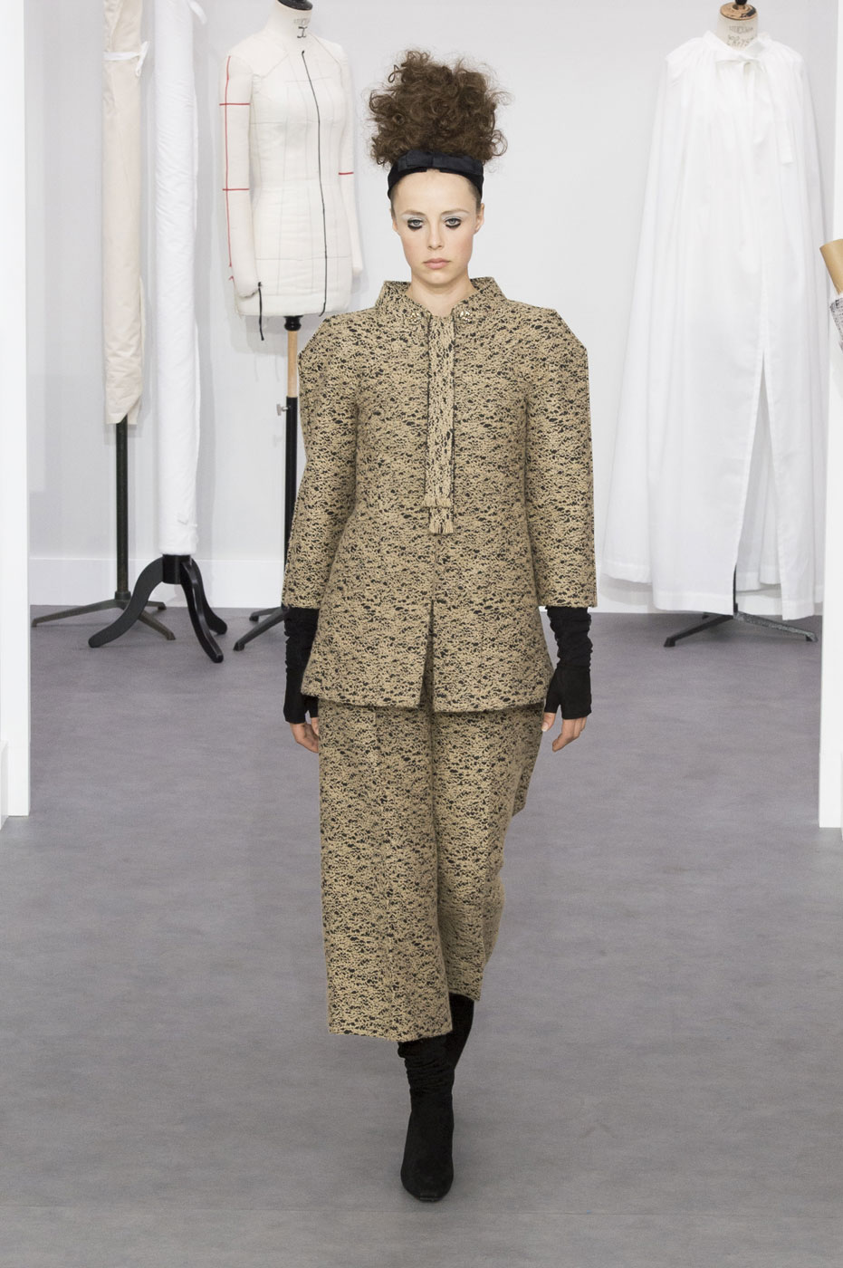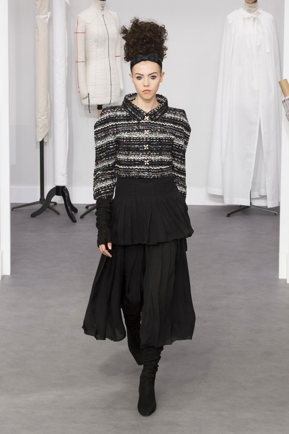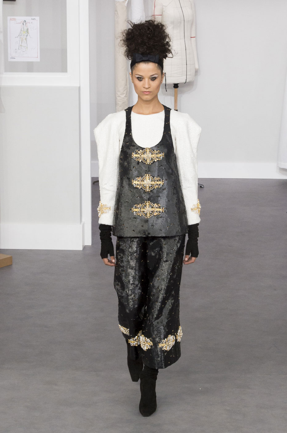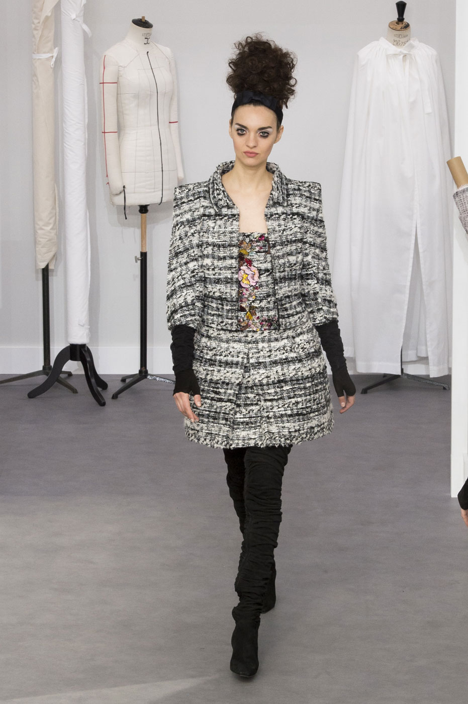 Heritage e sperimentazione. La collezione fall/winter 2016-17 di Chanel è un tuffo nell'archivio della maison che Karl Lagerfeld questa volta evita di dissacrare rispettandone i canoni classici, vivacizzati con decori a contrasto di grande eleganza. Capo cult resta il tailleur in tweed con giacche oltre i fianchi o appena a toccare la vita, mentre le gonne sono per lo più mini, anche balloon e in colori caldi come l'arancio. Come un funambolo, il designer si mantiene in equilibrio tra la sua innata voglia di sperimentare e la voglia di omaggiare la tradizione stilistica di Chanel con capi dalle lunghezze variabili, per lo più completi dall'allure ladylike. I cappottini hanno maniche egg shape o appena a palloncino, spesso corte o a tre quarti abbinate a maniche nere stile guanto con tutta le dita allo scoperto. Cuissard aderenti in camoscio fasciano la gamba mentre piume, ricami anche geometrici e glitter illuminano capi dal taglio rigoroso.