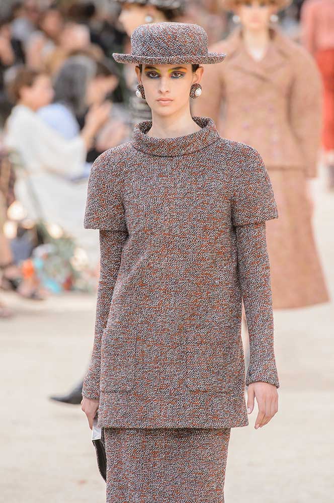 Talvolta il tweed, presentato in diverse varianti di colore, è sdrammatizzato come stoffa cult della maison contornando le tasche o il collo con tanti cerchi multicolor di seta sovrapposti l'un altro. Iconici e ironici.